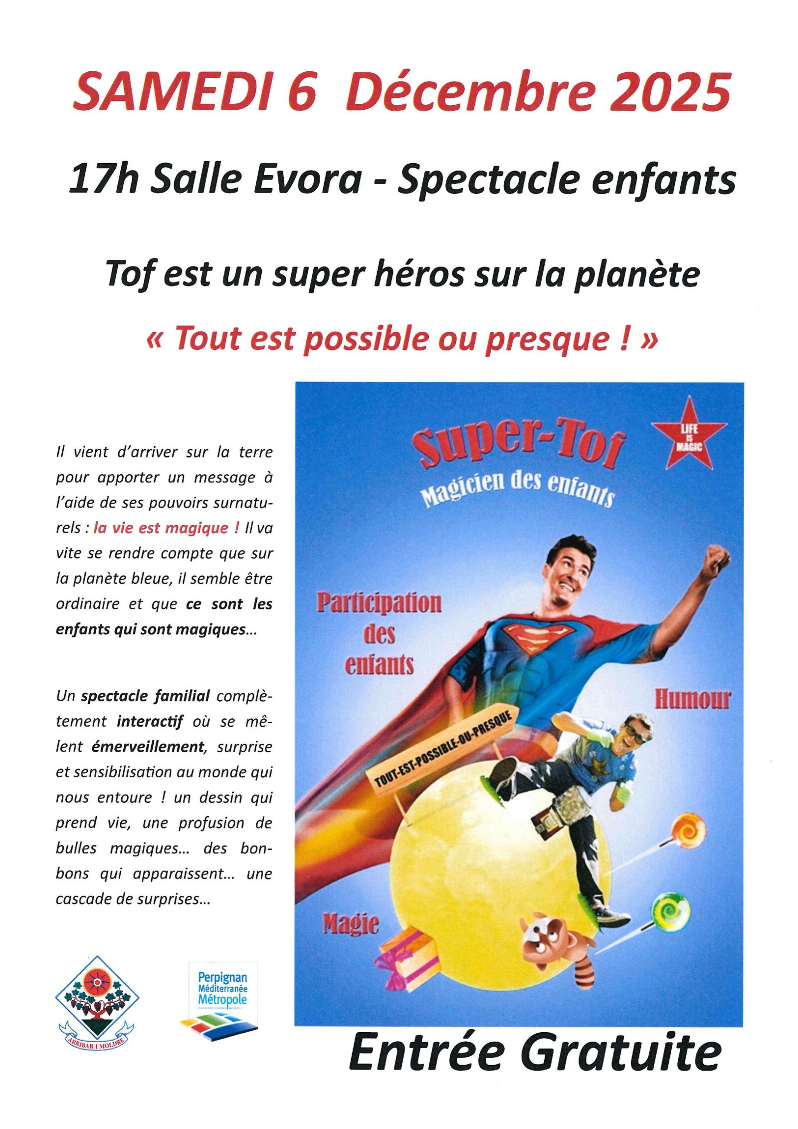 SPECTACLE GRATUIT POUR ENFANTS SAMEDI 6 DECEMBRE A 17H SALLE EVORA