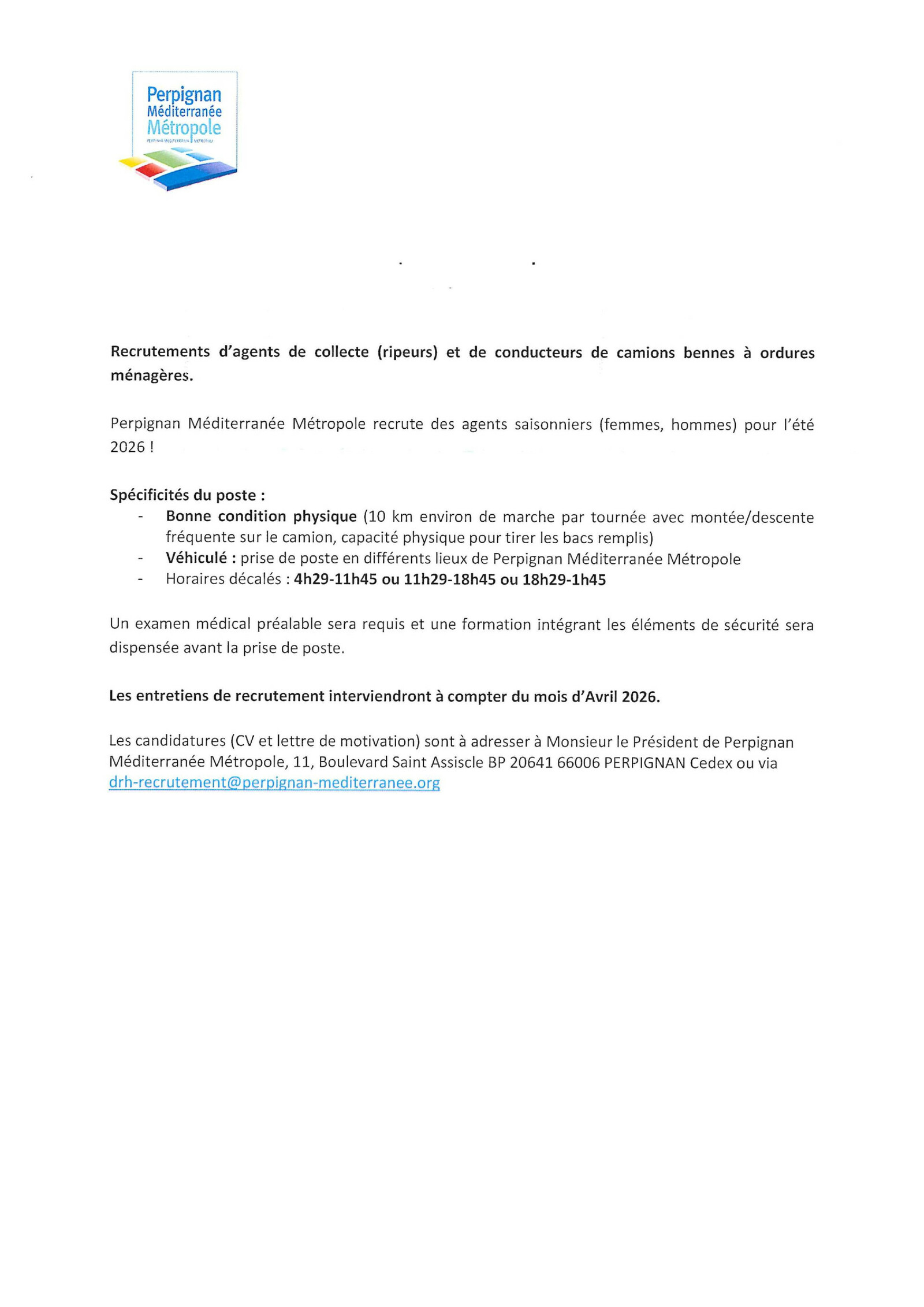 RECRUTEMENT D'AGENTS DE COLLECTE ET DE CONDUCTEURS DE CAMIONS BENNE SAISON ESTIVALE 2026