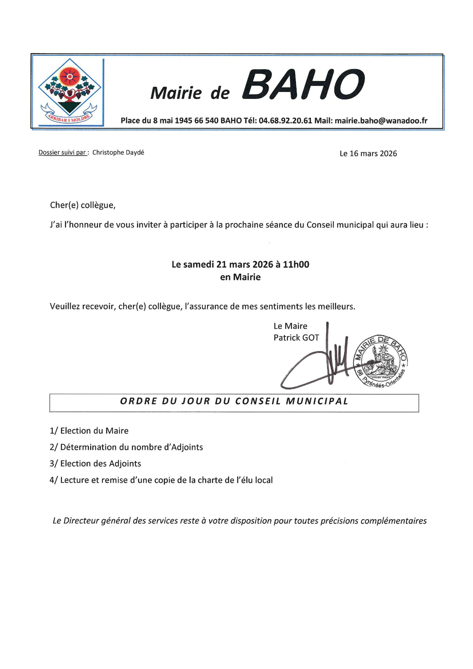 INSTALLATION DU CONSEIL MUNICIPAL SAMEDI 21 MARS 2026 A 11H
